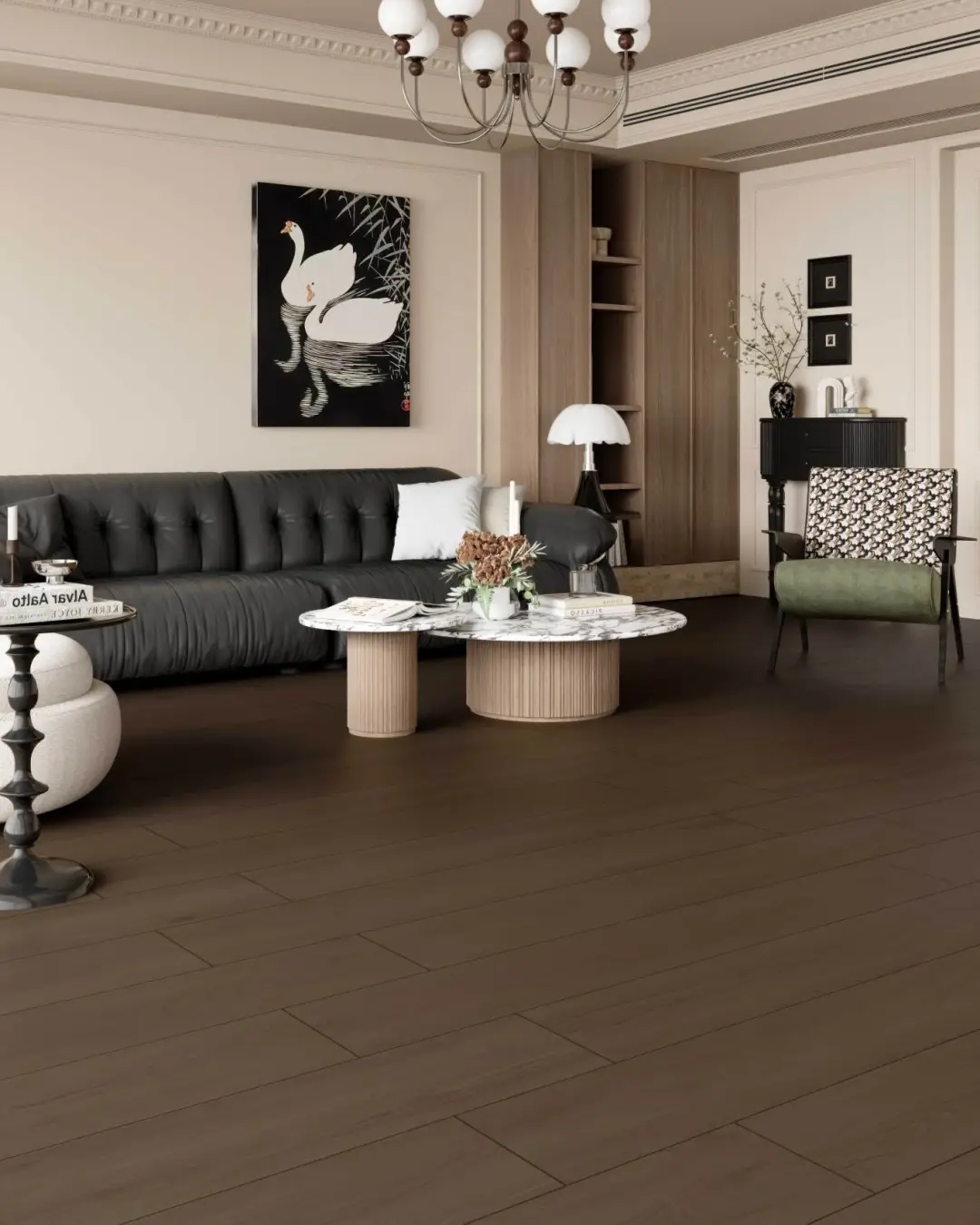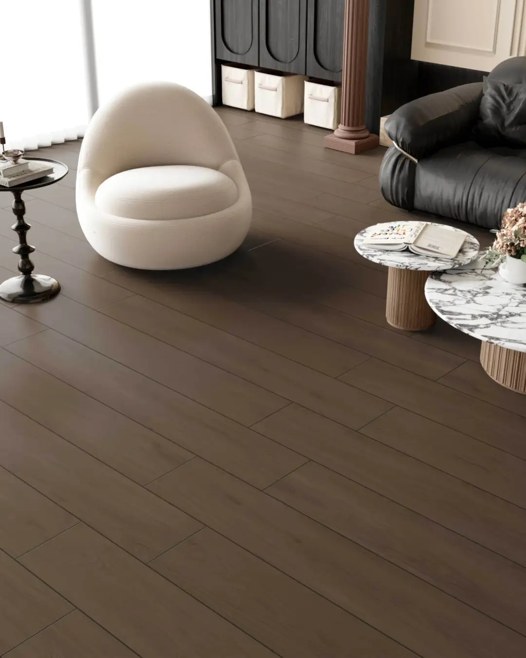 空間的層次在材質中自然遞進,深色木紋磚,是意式的低音符,光線穿透木紋肌理,也塑造了極簡而不失韻律的視覺層次。