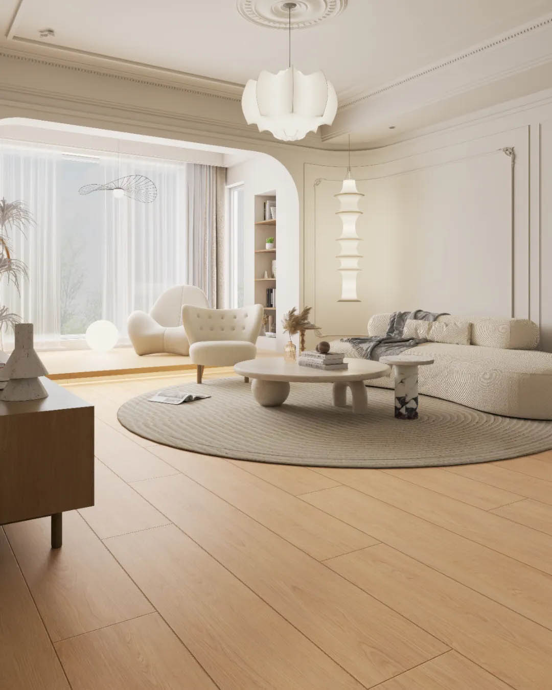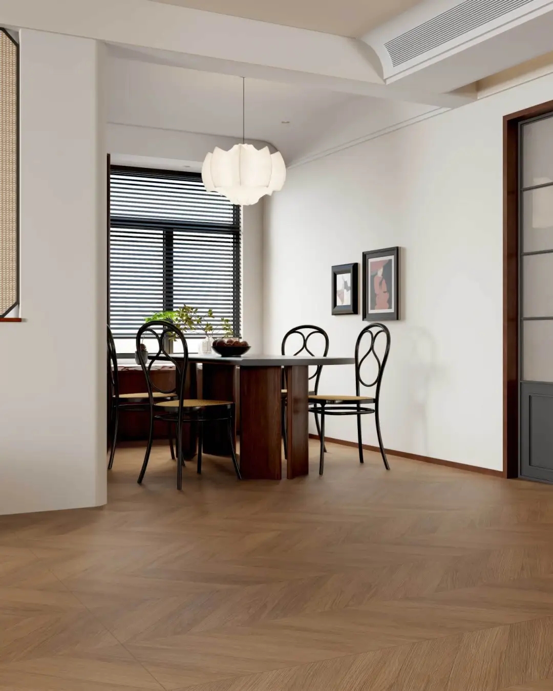 整體空間以原木為筆觸,梧桐黃調木紋磚沉穩(wěn)肌理,結合三七錯縫鋪法,在日式原木家具的溫潤觸感下,織就一幅克制而豐盈的畫卷。