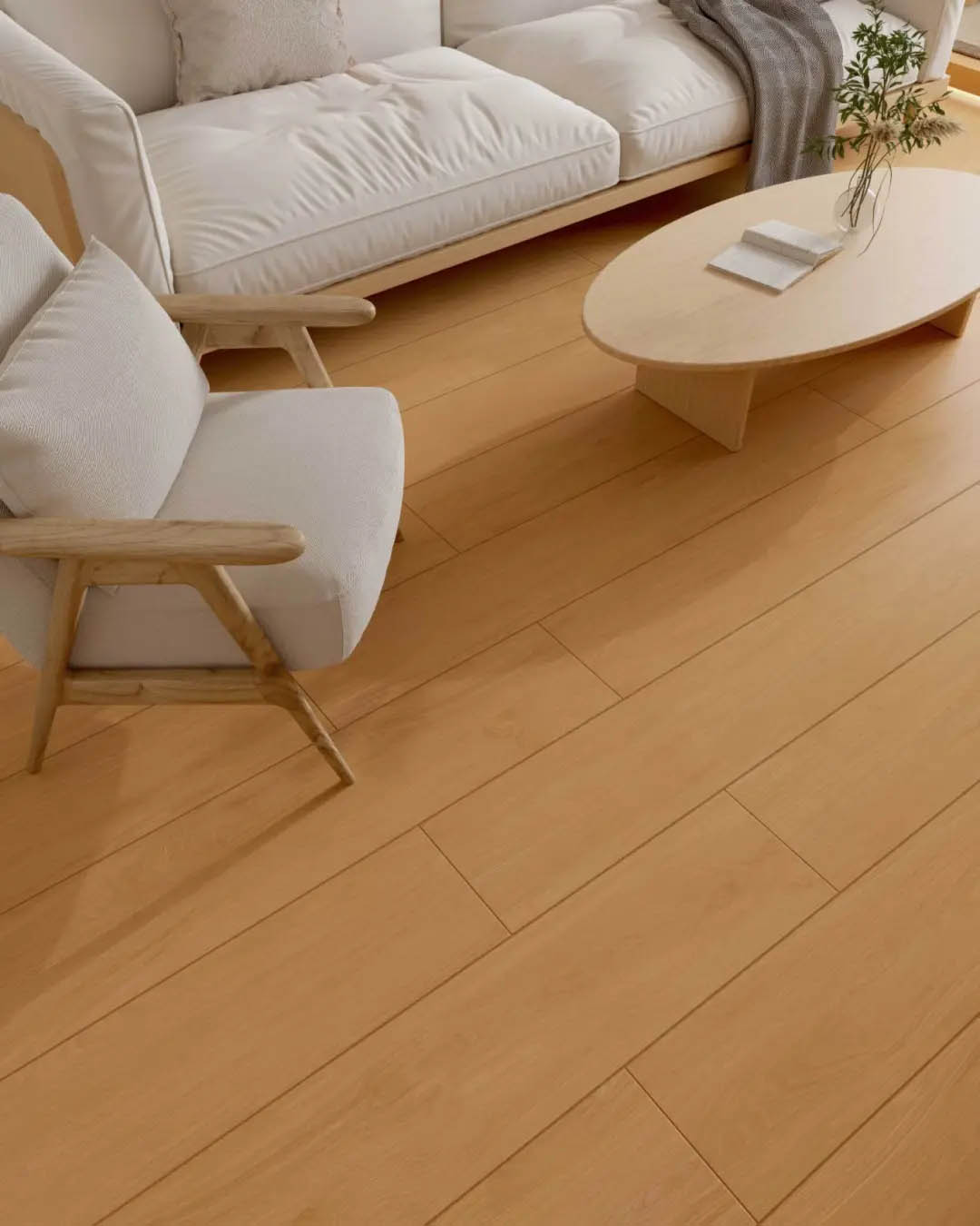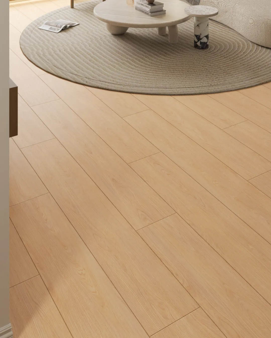 整屋采用奶油色為基調,搭配上250x1500mm原木色木紋磚通鋪,采用數碼模具工藝,還原木材紋理和純正色彩,盡顯自然溫潤與原始美感。